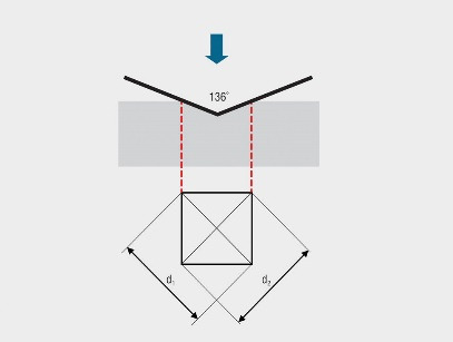 The Vickers hardness test uses a square-based pyramid diamond indenter with an angle of 136° between the opposite faces at the vertex, which is pressed into the surface of the test piece using a prescribed force, F.